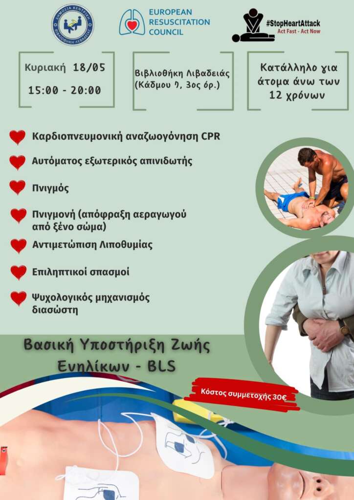 Η Δημόσια Κεντρική Βιβλιοθήκη Λεβαδείας και το Stop Heart Attack συνδιοργανώνουν σεμινάριο Πρώτων Βοηθειών “Βασικής Υποστήριξης Ζωής – BLS (Basic Life Support)” διάρκειας 5 ωρών και με πιστοποίηση από το Ευρωπαϊκό Συμβούλιο Αναζωογόνησης (ERC).